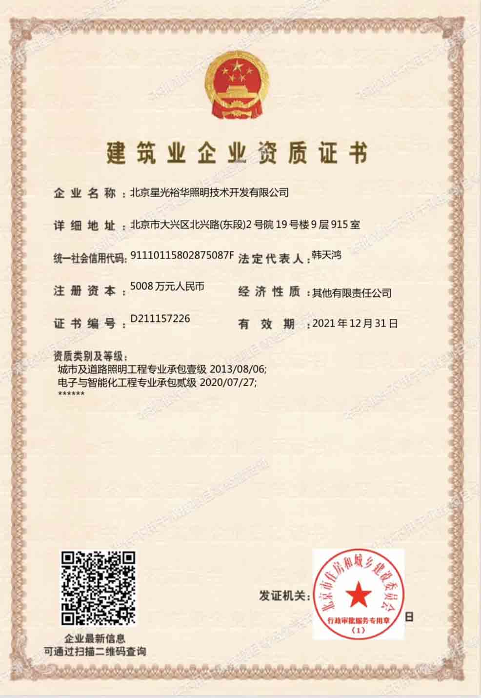北京星光裕華照明公司榮獲 “電子與智能化工程專業(yè)承包貳級”資質(zhì)
