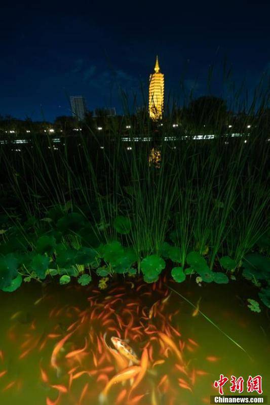 7月30日,西海子公園的水面、蘆葦、荷葉、錦鯉,與夜晚點(diǎn)亮的“燃燈塔”相映成趣。