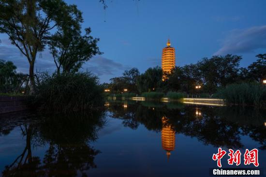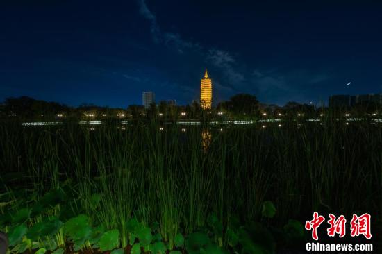 7月30日,從西海子公園水面觀望夜晚點(diǎn)亮的“燃燈塔”。(中新社發(fā) 史春陽 攝 圖片來源:CNSPHOTO)